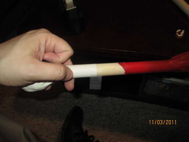 Mientras sostiene el balón, utilizar cinta adhesiva para pegar el globo cortado el tubo de plástico.  Saque los extremos de goma para que el hueso se ve ras, sin ningún golpe.