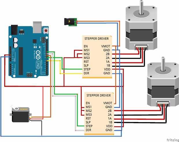 Como conectar en imagen fritzing o ir al siguiente paso y hacer PCB (placa de circuito para imprimir). Y debe encontrar ajustes necesarios para el potenciómetro de control de motores paso a paso. Con este potenciómetro se puede controlar el voltaje que va a motores paso a paso. Intentar establecerlo que mueve el paso a paso es tan suave como posible.