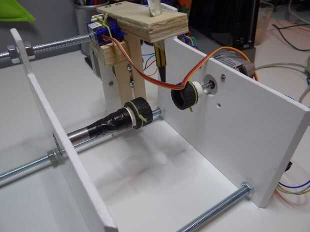 Pluma brazo fabricado con madera y plástico. En el extremo del brazo hice hoyo de 9mm para marcador