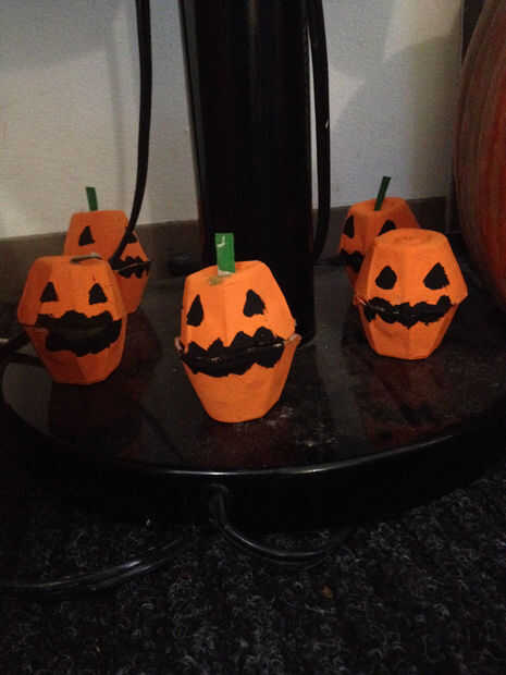 Cortar la tapa de cartón de huevo en tiras y píntalas de verde, estos son lo tallos, una vez seco, empuje en la parte superior de la calabaza