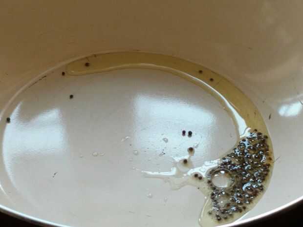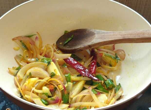 Caliente el aceite en una sartén a fuego medio. Avancen las semillas de mostaza y freír chiles rojos secos.