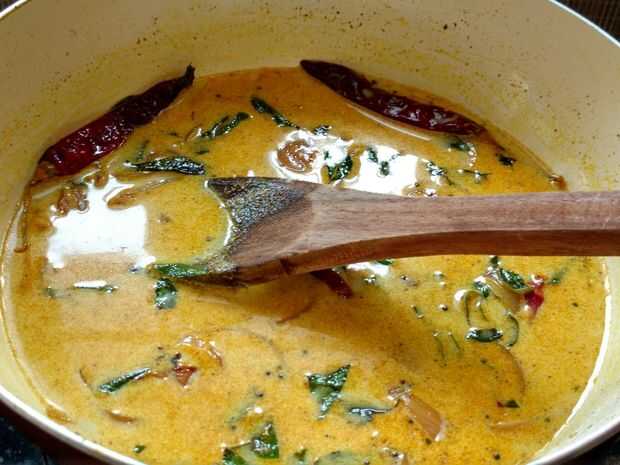 Añadir 1 y 1 1/4 taza de leche de coco gruesa mediana y 1 – 2 pizcas de polvo de la pimienta. Cocine a fuego medio.