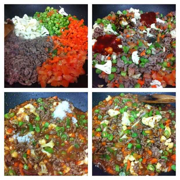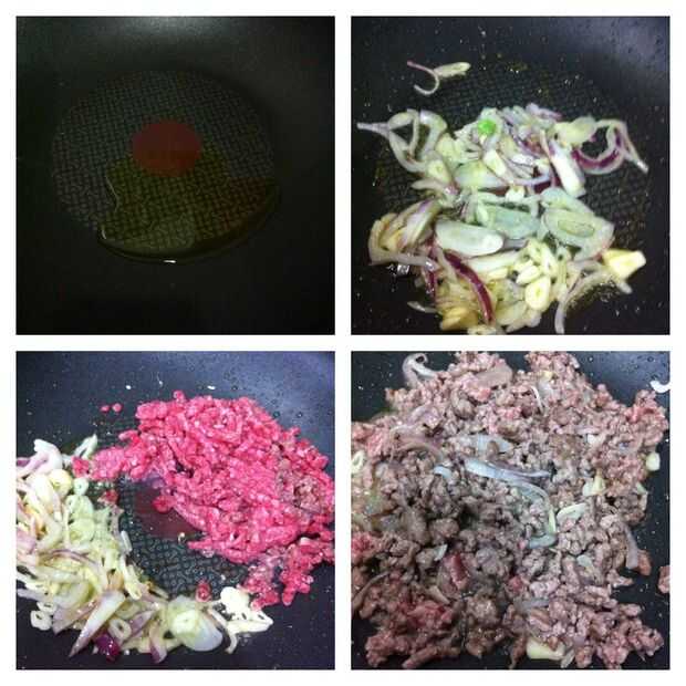 3. Agregue la carne picada. Revolver unos 3 a 4 minutos.