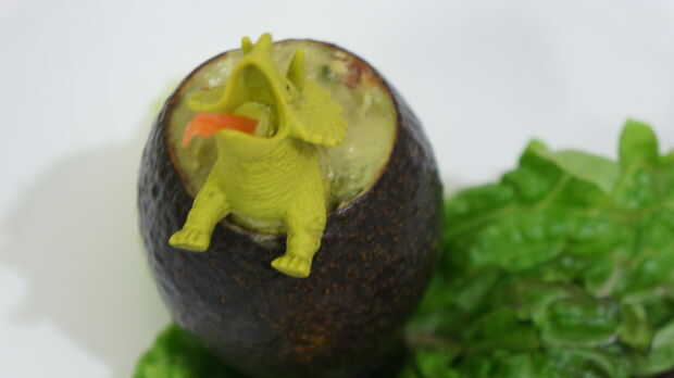 Cortar una astilla de un tomate para colocar dentro de la boca de los dinosaurios.