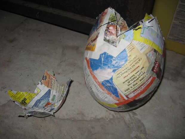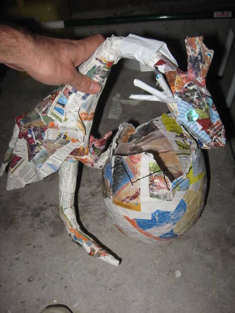 Una vez completamente seco el papel maché sobre el globo, marcan un patrón de zig-zag en la parte superior del huevo donde el dragón se va rompiendo de la cáscara de huevo. Cortar esta forma hacia fuera y luego cubrir los bordes con más papel maché para que el huevo limpio y fuerte.