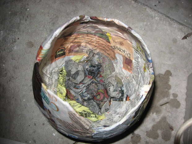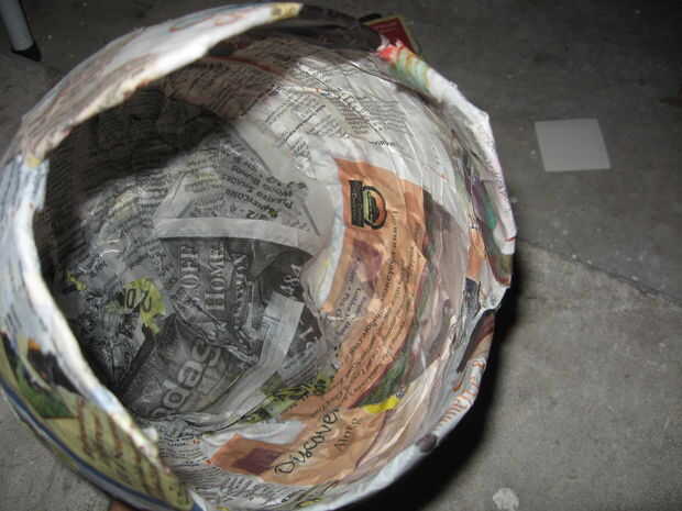 Para añadir peso extra a la parte inferior del huevo, que para mantenerlo de pie recto, I arrugado encima de un montón de periódico mojado en cola y pegado a la parte inferior del interior del huevo. Luego poner las tiras de periódico sobre el papel arrugado y déjelo secar por unos días.