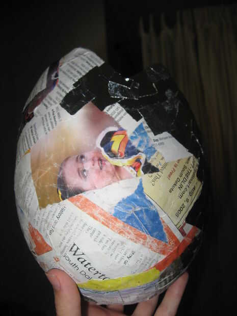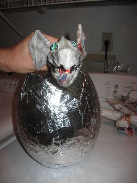 me encontré con alguna cinta de aluminio en Wal-Mart que se asemejó a papel de aluminio con un lado adhesivo. Quería que el huevo de dragón a ser brillante, por lo que parecía ser perfecto. Tomando pequeños trozos de cinta a la vez, cubrí todo el exterior del huevo con la cinta y la mayoría del interior. Creo que era un poco más tediosa y luego pintar el huevo, pero funcionó.