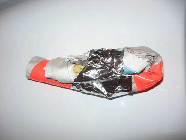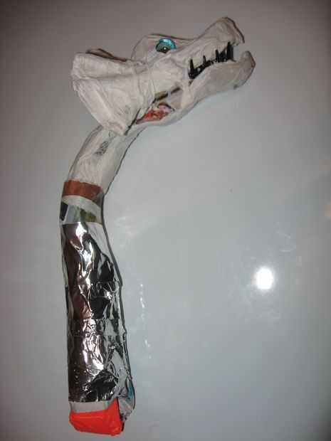 Una vez el huevo está cubierto en cinta de aluminio, y el dragón está completamente seco, empezar a experimentar y encontrar una posición en el huevo que el dragón se ve bien. Una vez que spot elegido, cinta rollo y algún diario para añadir longitud al cuello de dragones por lo que llegará a la planta del huevo. Cinta y papel mache los dos juntos, y y pasar al siguiente paso.