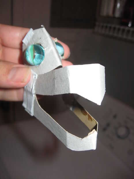 Los componentes cartón ojos y boca estaban conectados uno al otro con cinta y ajustados a la expresión deseada. Una vez satisfecho, graba la cara a la bola de papel que sirve como la cabeza.