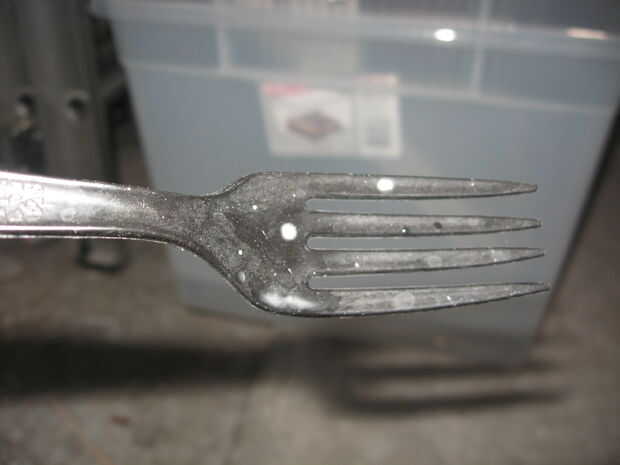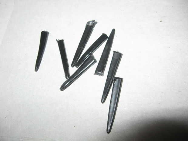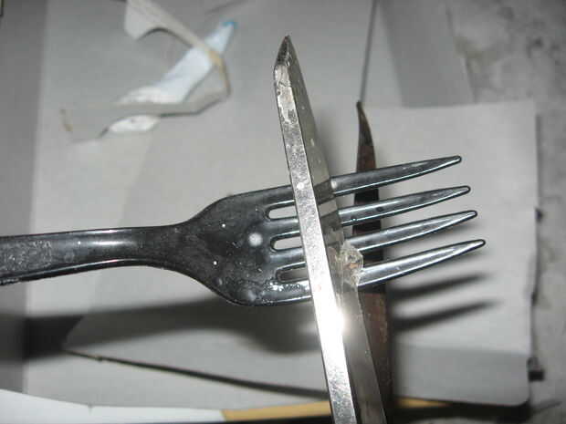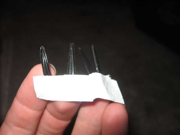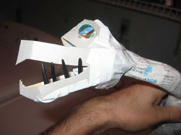 Para los dientes del dragón, utilicé los dientes de algunos tenedores de plástico. Los dientes cortan fácilmente con tijeras normales. Una vez que había recogido unos cuantos, tomé una tira de cinta y colocar los dientes en la tira. La tira de cinta y adjunta los dientes se coloca en el interior de la cartulina que forman las mandíbulas del dragón.
