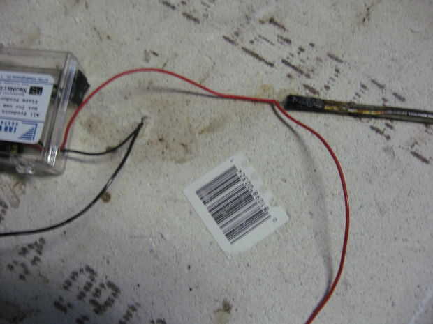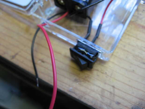 Pele los extremos de los cables y luego enrosque los cables del interruptor de la caja a través del orificio de montaje. Coloque el soporte de la batería en la caja. Utilice la tapa de la caja para fijar el alambre negro del soporte de la batería y el cable rojo del interruptor. Tuerza los extremos pelados, untar con flujo y luego suelde la conexión. Luego pegue el soporte interruptor y batería en su lugar. Una vez que el pegamento se haya secado pase el alambre restante del agujero. Soldadura en alambre más si es necesario.