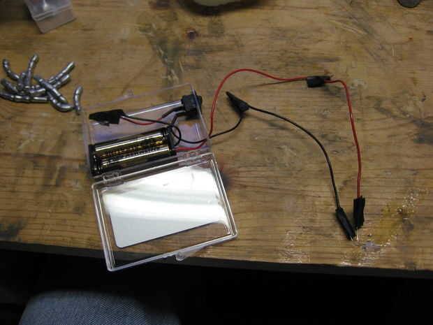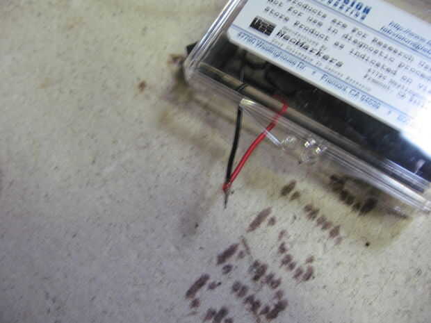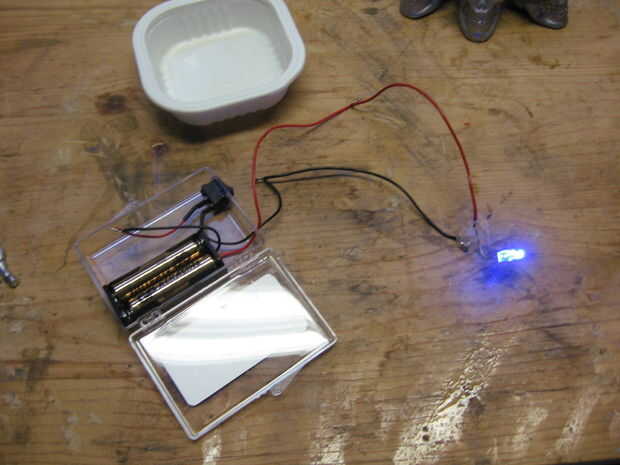 Se trata de un simple circuito mediante un LED de 3 v, un interruptor y un soporte de la batería instalado en una caja de plástico.