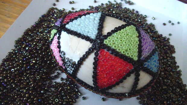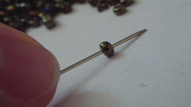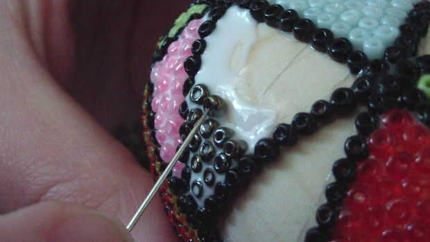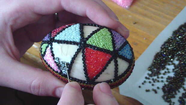 Primero trazamos con un lápiz los patrones del diseño. Después ponemos pegamento en esa zona donde empezar o donde queremos trabajar. Con la ayuda de la aguja que recoger los granos y con cuidado se puso en el rastro, siguiendo el patrón.