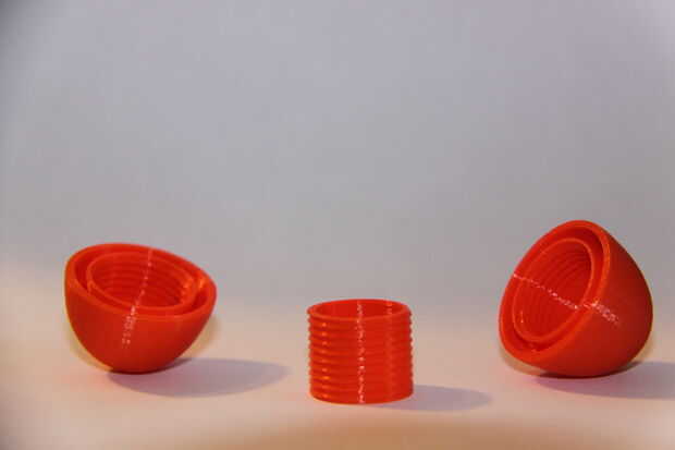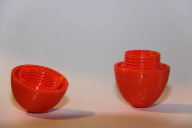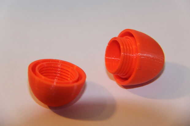 Este es el interior del huevo. Se compone de tres partes. La carcasa superior, carcasa inferior y una barra roscada. Las dos conchas tienen roscas en el interior para ser instalados por la Cruz roscada, que es hueco. Los hilos de uno de los huevos deben ser menores, por lo que la barra debe ajustarse muy bien dentro de esta cáscara. Esto hará que la barra ser unida a una de las cáscaras, por lo que cada vez que se desenrosque el huevo, sólo una cáscara Desenrosque cada vez.