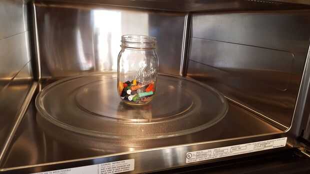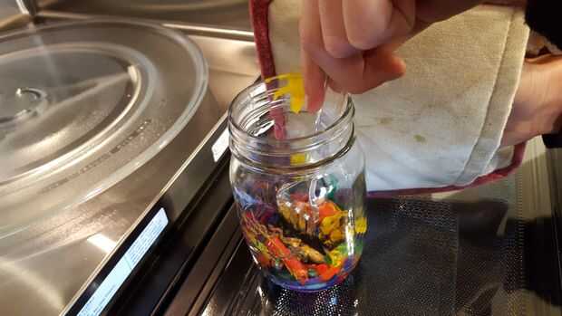 Ahora debe tener sus lápices de colores listos para fundir. Coloque la jarra de cristal llena de lápices de colores en el microondas y set de 4.5 a 5 minutos. Cada 30 segundos, retire la jarra y revuelve con una cuchara de plástico o un cuchillo. Tenga cuidado; el frasco se calienta.