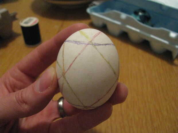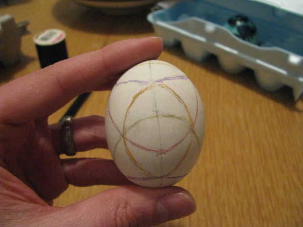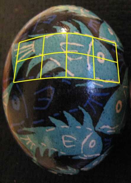 Para el mosaico de "Peces y olas", la red es mucho más simple. Partí el huevo en 16 secciones verticales añadiendo líneas de longitud adicional. Entonces agregué 3 líneas de la latitud por encima y por debajo de la línea de latitud central para dividir el huevo en una cuadrícula de 16 X 8. Cada gran unidad fue construido a partir de ocho (2 X 4) cajas para rejillas