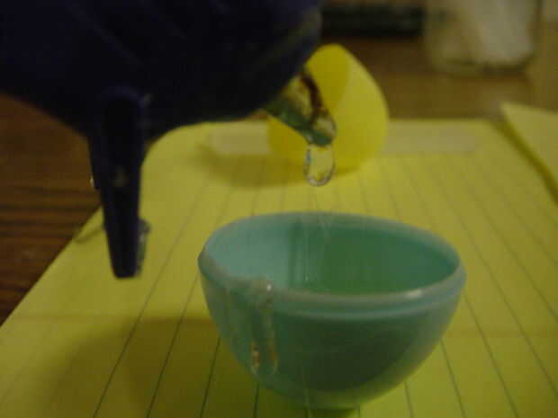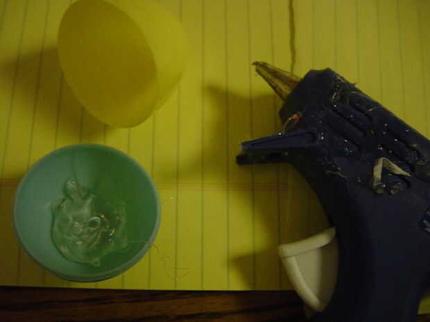 Tomar la mitad de su huevo el rechoncho y llenarla hasta el borde con pegamento caliente. Asegúrese de que tiene un pedazo de papel bajo su área de trabajo para reducir el desorden. Luego deje que se seque.