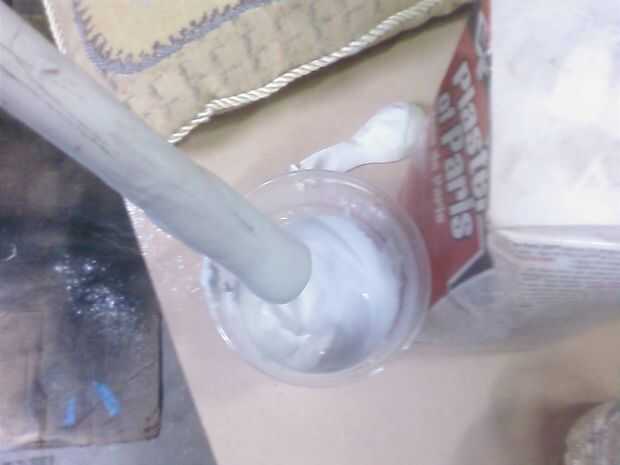 En esta foto yo uso un pedazo de tubo PVC de 1/2". No una buena opción, la próxima vez que utiliza un destornillador para mezclar. Tratar de eliminar la mayor parte de los terrones. Apuesto a que un mezclador de la pintura en un taladro funcionaría bien.