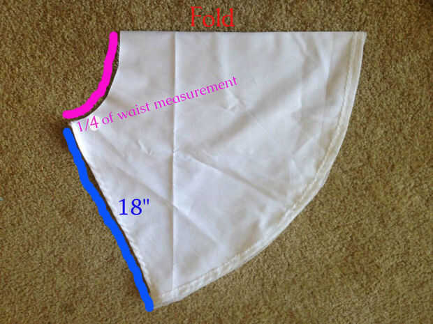 Esta pieza es casi la mitad de una falda de círculo. Tomar la medida de su cintura y 1/4 desde el delantal sólo va a mitad de camino alrededor de su cuerpo y se corte en un pliegue. Doblar la tela blanca están utilizando y bosquejar hacia fuera a menos de un cuarto círculo (lo que hice fue cortar el círculo cuarto luego recortado hasta el tamaño que pensé parecía mejor). La longitud de su falda es suya pero hice mía 18".