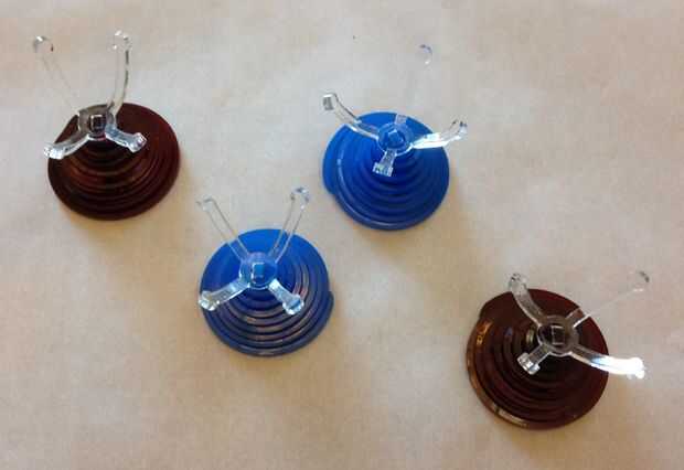 Este paso va bastante rápido. Aplicar un pegamento a las superficies que se enclavija de cada pieza base y deslice dentro de otra. Una vez que los secan, aplicar algún pegamento en las lengüetas en la parte superior de las bases y establecer un espiral en cada uno. Finalmente, aplique un pegamento en la parte superior del centro de las espirales y coloque los brazos claro en la parte superior. Esto completa el montaje de los soportes de huevo!