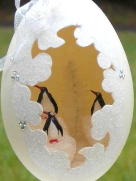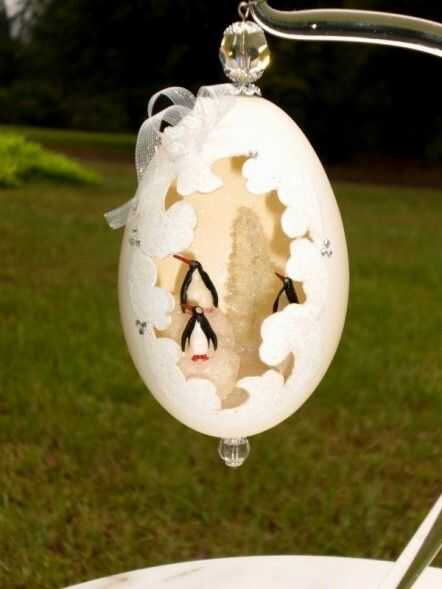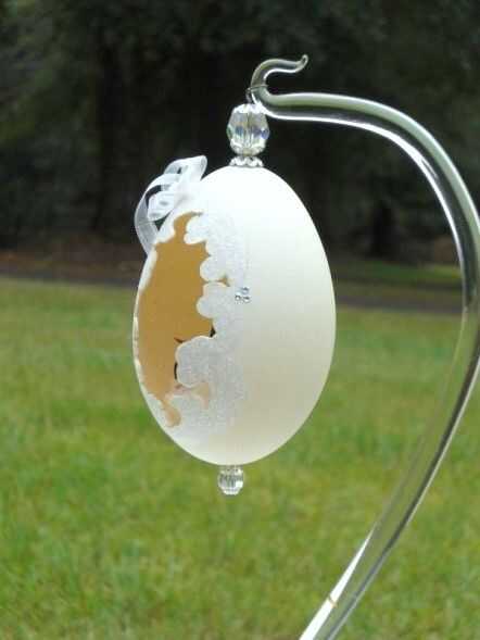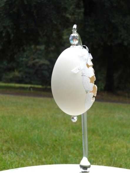 esto es un verdadero huevo. En el interior es un ave del paraíso de cristal. El huevo está decorado con flores, cintas, pedrería, apliques, pintura y diversos Permanentemente a la base.