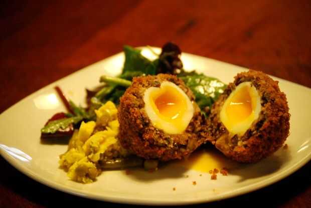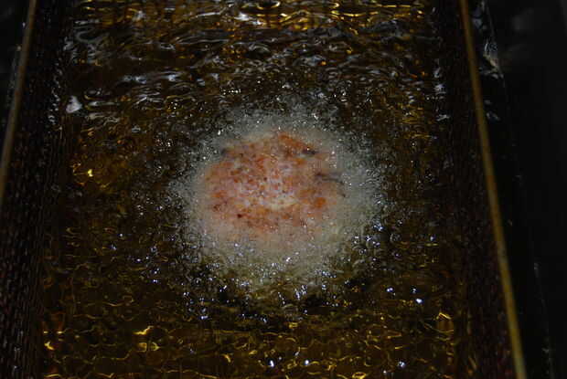 Cuando el pan rallado esté dorado la bola debe ser cocida, si están un poco preocupados sólo espere un poco en el horno caliente. La fritura debe tomar unos 5 minutos. Pat de exceso de grasa con un paño de cocina. Servir con piccalli, mostaza inglesa, o lo que te apetece. Infierno, la tuya ahora.