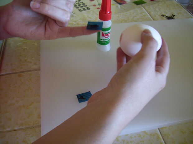 Así que si eres como yo, que tenga a capa dos imágenes juntos, toman algo de tiempo para hacerlo. Una vez hecho esto (o si no tienes), es tiempo de cosas de pegamento en el huevo. Antes de comenzar, asegúrese de que el interior de tu huevo es seco. Si no, esperar hasta que, de lo contrario te sufren mucho de desamor.