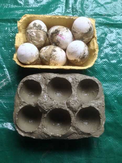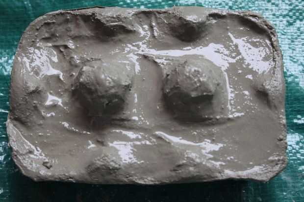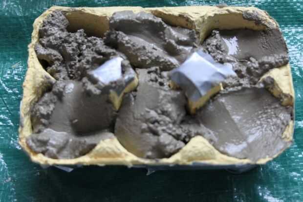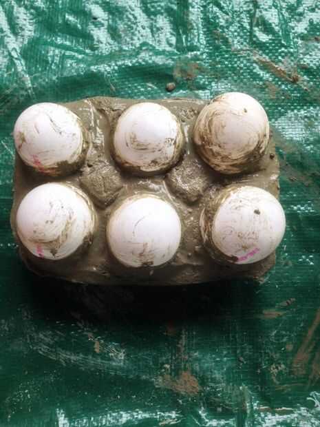 Llenar el molde con la mezcla de concreto, inmediatamente empezar a colocar los huevos en el molde. Tienes que hacerlo lentamente girando los huevos ir abajo... No tan rápido como sea posible antes de que consigue endurecer el concreto. Si es necesario nivelar el hormigón en la parte superior con un objeto plano.