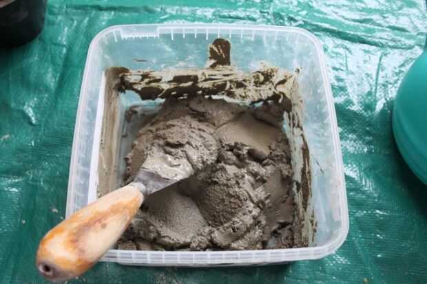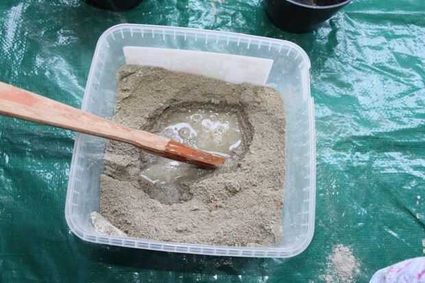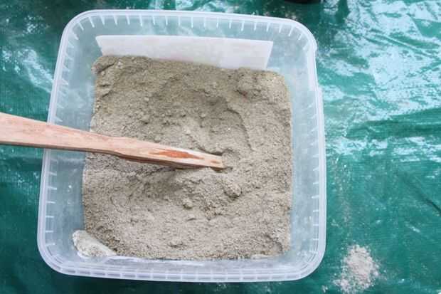 Luego mezclar el cemento y la arena bien y luego agregar agua poco a poco para conseguir la consistencia correcta. No demasiado fina o demasiado gruesa. Mezclé dos partes arena cemento de parte de uno y una mitad.