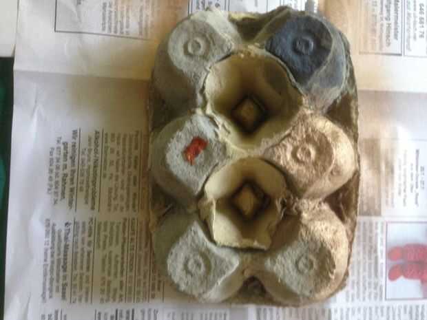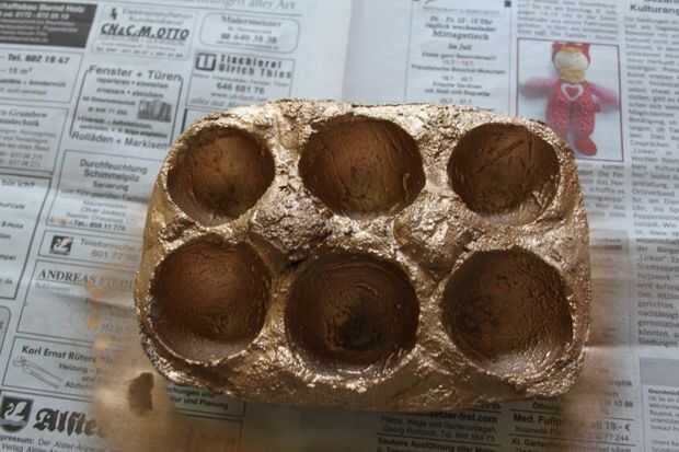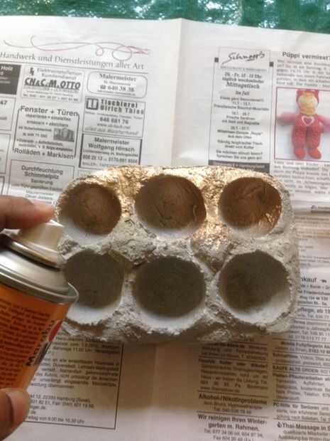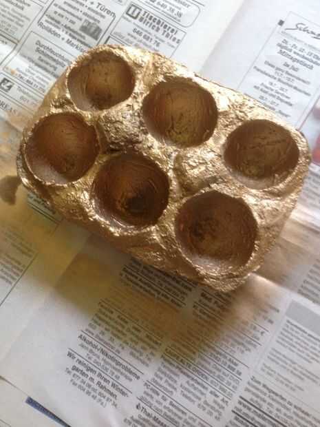Mira la primera imagen... Probé tres colores en la parte inferior de la base de huevo. METALIC, bronce y oro embotado. Prefiere el oro embotado y roció el stand de huevo entero con spray de oro... Utilizando pintura en aerosol es mucho más fácil que la pintura. Se seca dentro de unos pocos minutos.