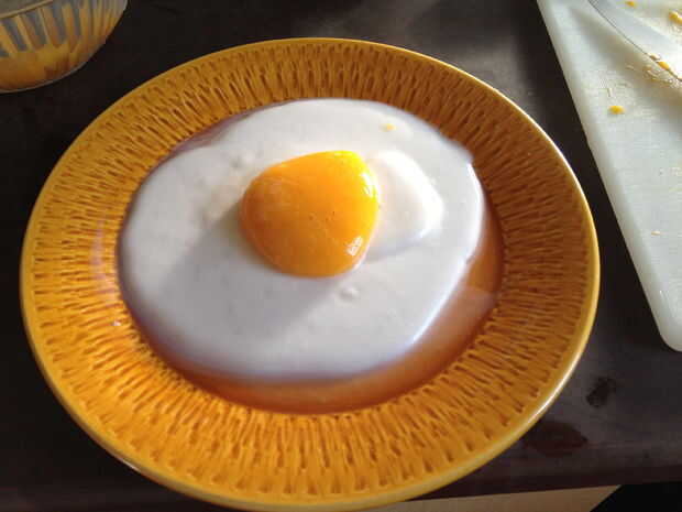 Cuidadosamente con la espumadera, levantar las yemas fuera el jugo de mango, enjuague en un tazón de agua fresca y coloque en el centro de la segunda capa de clara de huevo.