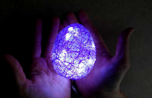 he utilizado cristal adoquines y azulejos para crear una apariencia de vidrieras de este huevo. Usando una técnica de azulejo de mosaico por pegar los pedazos de vidrio sobre el huevo y luego aplicar la lechada, luego coloca un LED dentro para ilumin