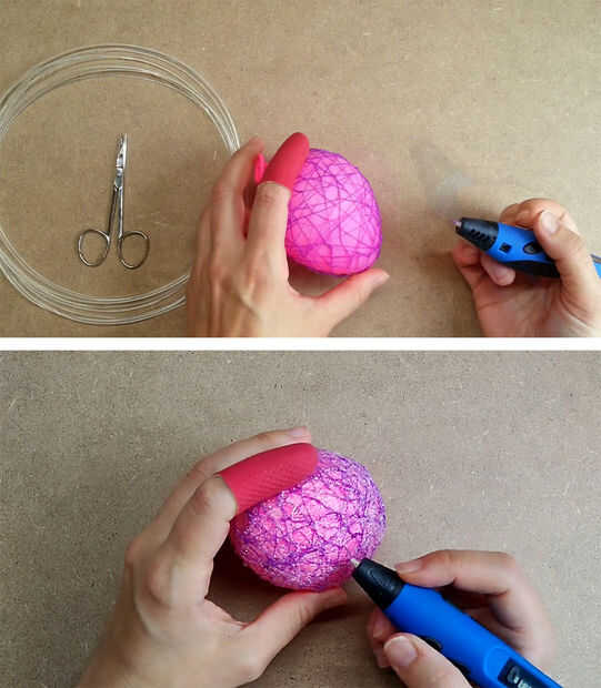 Se infla el globo al tamaño que desee. Envuelva el filamento a su gusto por el balón. Empezar a dibujar el color del filamento, elegí púrpura. Puede ir presionando suavemente el filamento caliente con el guante, lo pueden unir los cables bien. Debe llenar el vacío con filamento transparente, tratando de que los dibujos son formas poligonales.