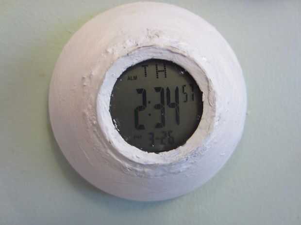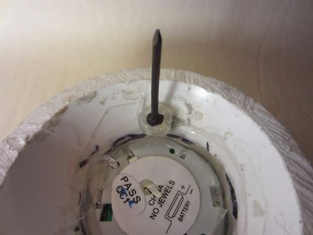 Este paso le permitirá colgar el huevo. En primer lugar, usted tendrá que encontrar el punto que se centra directamente sobre la cara del reloj. A continuación, usted necesitará poner una fecha de nacimiento de pegamento caliente en ese punto y pulse la uña en su lugar. Asegúrese de que el clavo es recto hacia arriba y hacia abajo y deje seco. Meter la uña en un agujero en la pared y ta-da, listo! Diviértete contestando preguntas sobre su cronómetro futurista de huevo!
