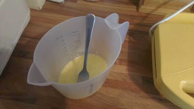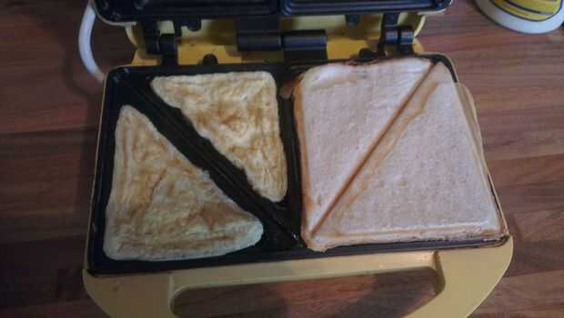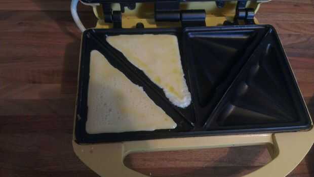Calentar una sandwichera y vierta un combate de 1/2 cucharadita de aceite en cada una de las dos mitades del "molde". Una vez listo, vierte la mezcla de huevo en ambas partes en cantidades incluso. Debe cocer en aproximadamente la mitad del tiempo como una sartén debido a su mayor superficie y se calienta por encima y por debajo.