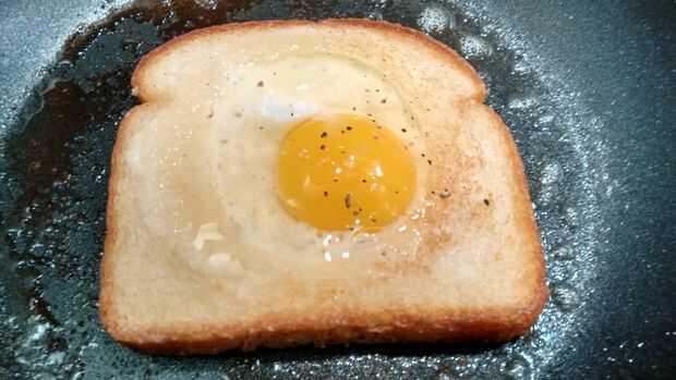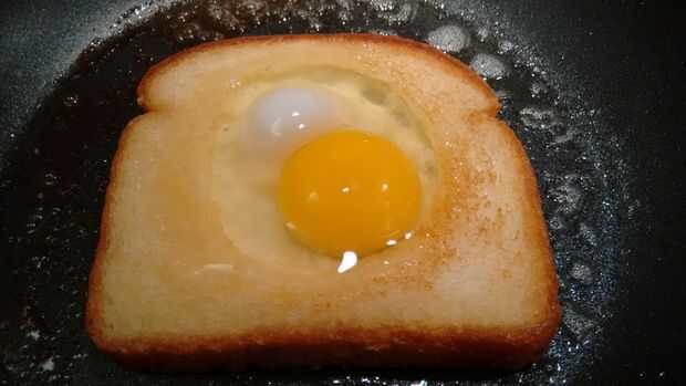 Cocer durante un par de minutos hasta que el huevo empiece a blanquear y su yugo comienza a espesar, luego voltee todo el asunto y cocinar otro minuto más o menos.