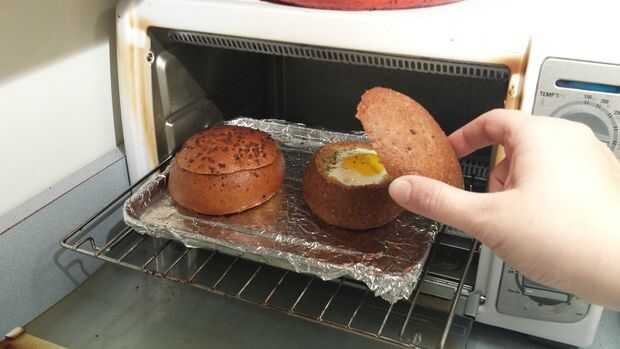 • Ahora tire de ellos hacia fuera, poner algunos cocina spray o mantequilla en su pedazo de tapa de pan y colóquela sobre el huevo en el nido.