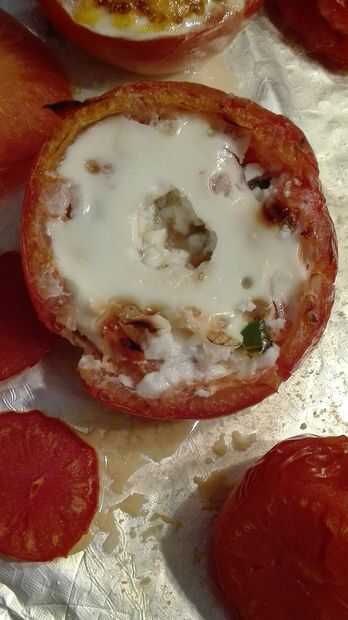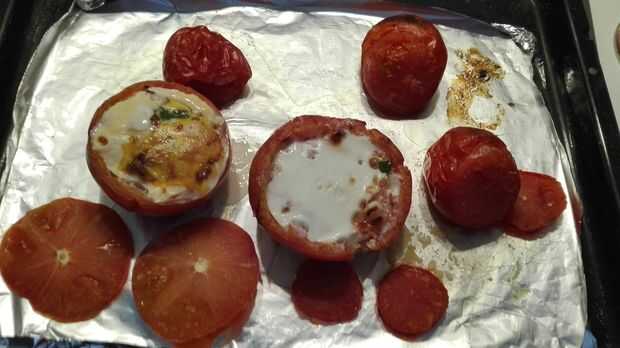 Cuando el horno esté listo, poner los tomates en la bandeja para hornear y en el horno durante 20 - 22 minutos. . (No sacar la yema de uno de mis tomates, en la izquierda y es cómo parecía, que fue la que más tarde cocidos gratinado)