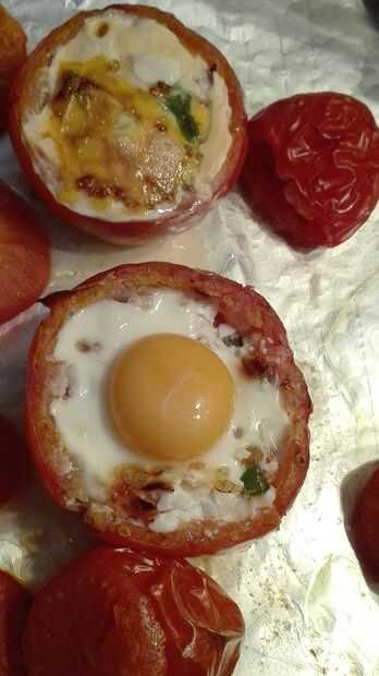 Luego, en el tomate sin la yema de huevo, hacer un agujero con un cuchillo, colocar la yema de huevo en él.