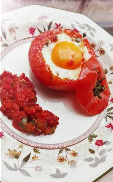 1 a 2 porcionesPaso 1: ingredientes roma 1 o 2 u otros tomate maduro, delicioso, corte en trozos grandes½ aguacate perfectamente maduro, cortado en trozoshuevos 1 (o 2)sal y pimientaPaso 2: método Coloque el huevo en una cacerola.  Llena la olla con