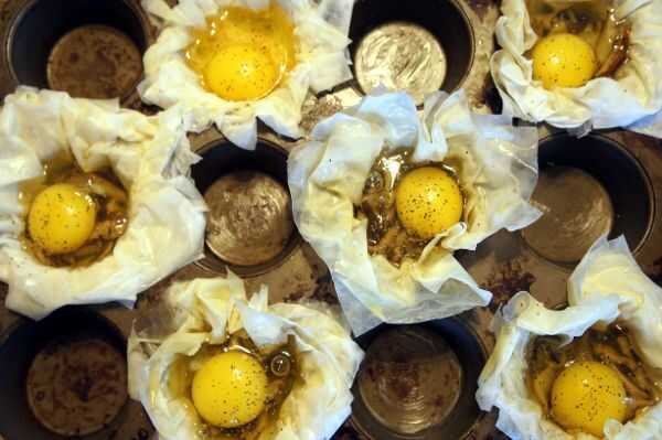 Lugar cerca de una cucharada de champiñones salteados en cada taza de filo. Romper un huevo en cada taza y sal y pimienta al gusto. Hornear durante unos 12 a 16 minutos o hasta que los blancos han establecido (agitar suavemente la olla para ver que no son demasiado zangolotean). Cubra cada uno con una pizca de cebollino y servir caliente.