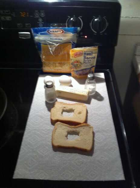 Primero después de que se ha reunido los ingredientes toman tus rebanadas de pan y cortan cuadrados suficientemente grandes como para dar a su sitio de huevo, aquí mi plazas fueron cerca de 11/4 pulgadas y mis huevos donde gran grado A huevos así su fue un poco apretada pero queremos suficiente pan para tostadas bueno cuando terminamos.