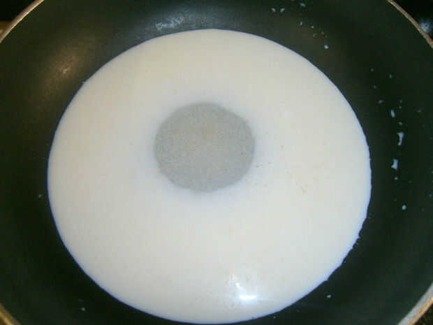 Añadir la harina de maíz y el agua a la leche. Calentar a fuego bajo hasta que vueltas cremosos.