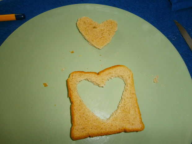 Cortar un corazón en el centro de cada rebanada de pan. Mantenga el corte de la mitad del corazón también.