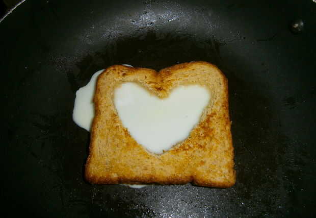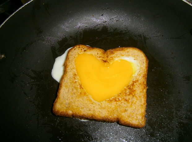 Añadir la yema de huevo. Simplemente empujé la yema de huevo con la espátula en las esquinas del corazón.