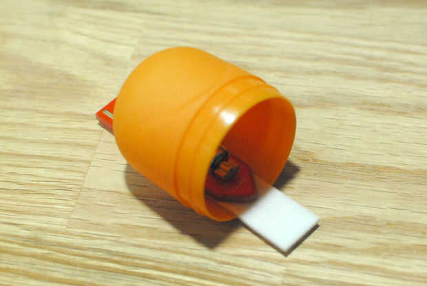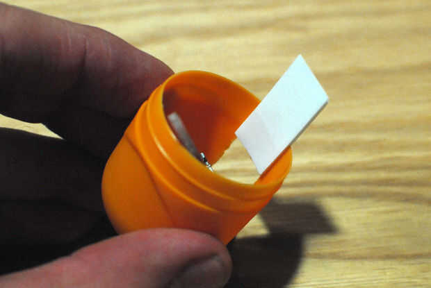 Pegar la almohadilla de espuma adhesiva a la zona de plástico entre la raja y la abertura principal de la mitad más grande del huevo. Empuje el extremo del motor de la Fizzbit hacia abajo en la almohadilla para unirla. Corte la parte de la almohadilla que es colgante y guardarla para el siguiente paso.