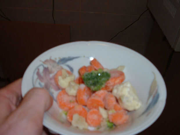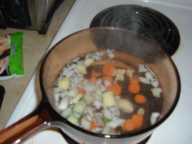 También querrás empezar a picar las verduras en este punto, si usted está usando verduras frescas. Tenía una bolsa de coliflor congelada picada, zanahoria y brócoli. No tomar demasiado; Esto es principalmente un champiñón y huevo sopa, no una sopa de verduras.