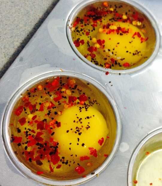 Espolvorea la sal a gusto, pimienta y rojo chiles las escamas sobre los huevos o su elección de aderezo.