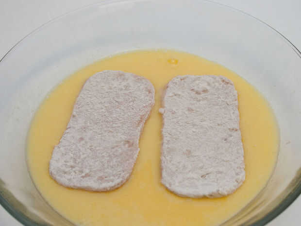 4. Entonces dip la harina había espolvoreada pedazos de SPAM en los 2 huevos batidos. Cubrir bien.