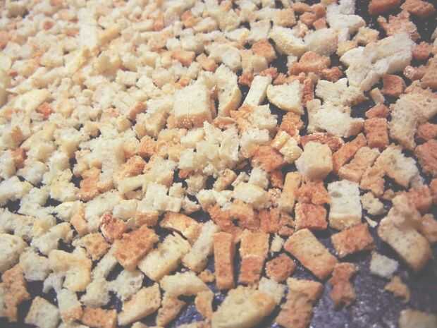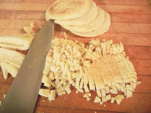 Cortar 2 bollitos picatostes pequeñas y tostadas en el horno a 400 hasta sólo comenzar a dorar, unos 6 minutos.
